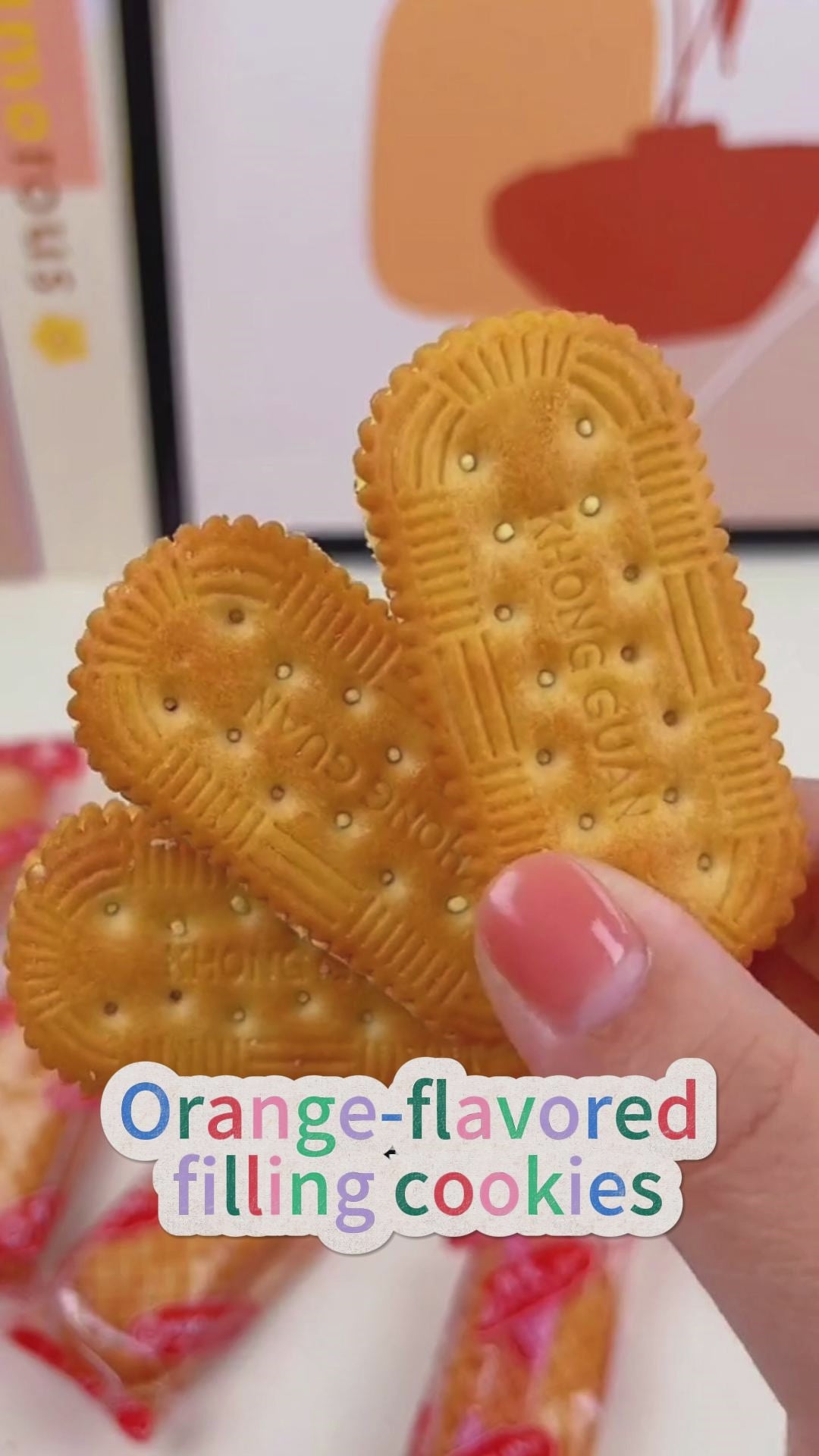 Two layers of crispy cookies are sandwiched between fresh orange flavored cream, with a light and sweet taste, and a natural and distinct orange aroma, cleverly balancing with the slight sweetness of the cookies. The independent small package is convenient to carry and suitable as an office snack, afternoon tea or children's favorite snack, especially suitable for consumers who love fruity fillings, bringing a bright and pleasant taste experience.